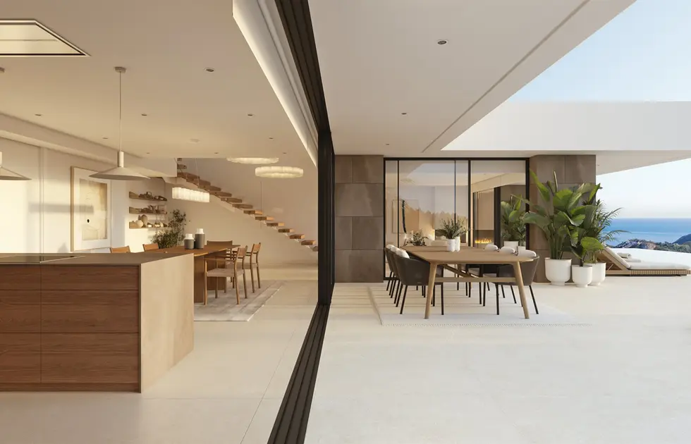 Naturalne światło obficie wpada przez duże okna wychodzące na tarasy, wzmacniając harmonię między wnętrzem a otoczeniem i czyniąc tę przestrzeń idealnym miejscem do korzystania ze śródziemnomorskiego stylu życia w pełnym komforcie.Minimalistyczna, ale ciepła estetyka wnętrz, zgodna z wyjątkową lokalizacją. Eleganckie meble, przemyślany projekt oświetlenia, duże płytki w neutralnych kolorach, minimalistyczna stolarka drzwiowa, optymalne rozmieszczenie każdego elementu – wszystko zostało zaprojektowane z dbałością o szczegóły, aby zapewnić całkowity komfort. W łazience typu en suite design osiąga najwyższy poziom poprzez staranne połączenie czystych linii, szlachetnych materiałów i harmonijnej palety kolorów.